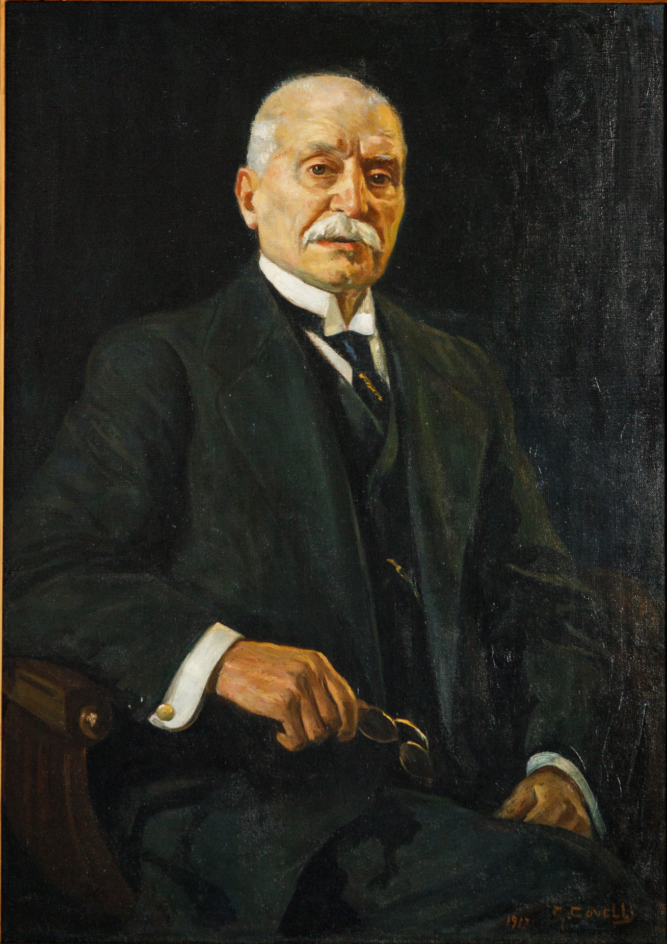 Il Ritratto di signorina inglese e il Ritratto di Sir Edward Letchworth (1915 circa, Beamish, The Living Museum of The North) ‒ del quale è qui esposta una fotografia conservata nel già citato archivio storico crotonese ‒ costituiscono i saggi più interessanti di Covelli nel genere del ritratto. Il primo, molto apprezzato dalla critica per l’eleganza dell’esecuzione del volto e dello sfondo cangiante, manifesta un chiaro aggiornamento sui ritratti femminili di Vittorio Corcos, Michele Gordigiani (1835 – 1909) e John Singer Sargent (1856 – 1925); il secondo ‒ presumibilmente risalente al secondo soggiorno londinese dell’artista ‒ ritrae un noto avvocato britannico vestito dei paramenti massonici della loggia di appartenenza e testimonia inoltre come la lezione inglese fosse stata pienamente assimilata dal pittore (cfr. Mileto 2022, p. 185, n. 21).
