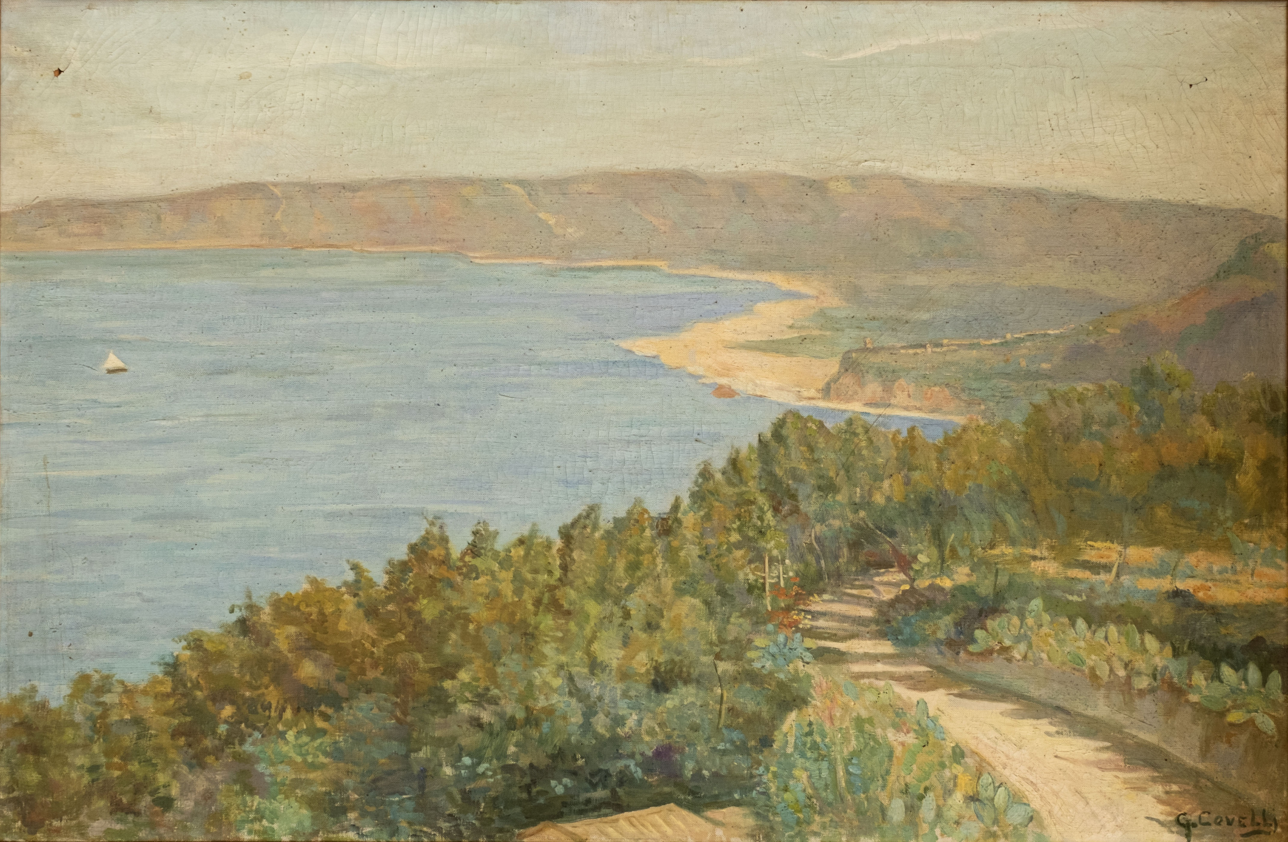 Per quanto concerne il paesaggio calabrese, esso è protagonista nelle due tele Veduta di Palmi da Villa Mazzini (1924) e Veduta del Golfo di Palmi (1924 circa), raffiguranti una veduta di Palmi e la sua marina. Esse non solo testimoniano il passaggio dell’artista nella città della provincia reggina, ma rappresentano anche le poche prove di pittura di paesaggio nella sua produzione. Non è dato sapere con esattezza come le due opere siano entrate a fare parte delle collezioni comunali di Palmi. Tuttavia, si può supporre che la missiva inviata il 13 gennaio 1927 dal Commissario Prefettizio del Comune di Palmi a Covelli (ASCKR, Fondo Gaele Covelli, b. 26, inv. 1006) ‒ per la conclusione di alcuni quadri già pagati ‒ riguardi proprio questi due dipinti, che forse furono acquistati dall’Amministrazione comunale direttamente dal pittore, in occasione della sua presenza alla III (1924) o alla IV (1926) biennale reggina.